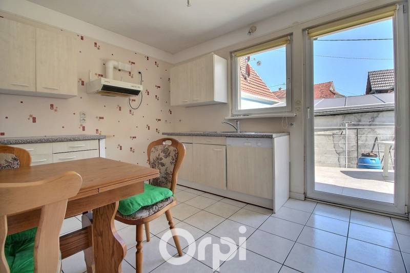 A l'extérieur de cette maison à vendre située à BETSCHDORF une belle terrasse de 23.30 m² donnant accès à la cuisine ainsi qu'un grand garage individuel de 31.85 m². La totalité de la parcelle est sur 2.39 ares.